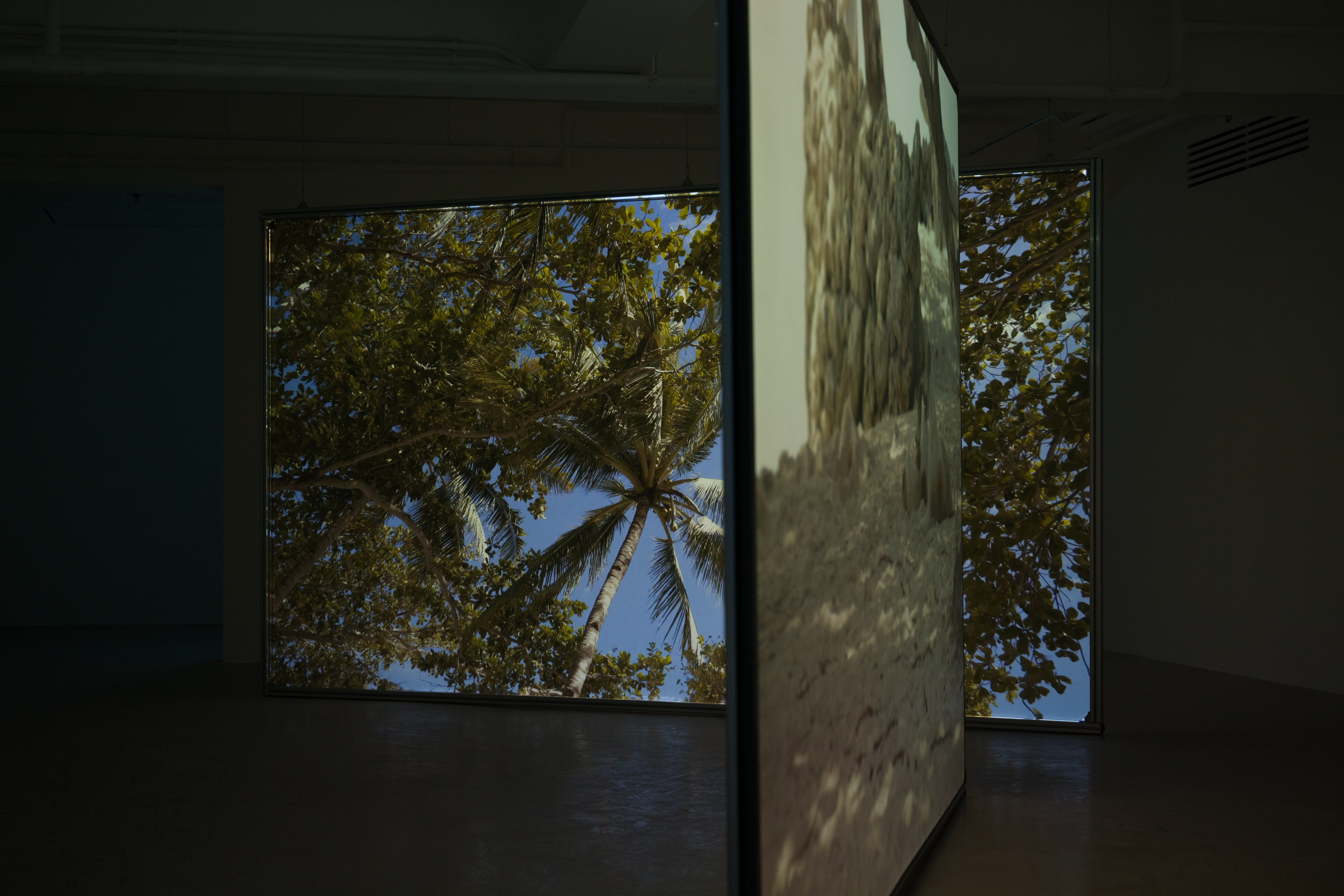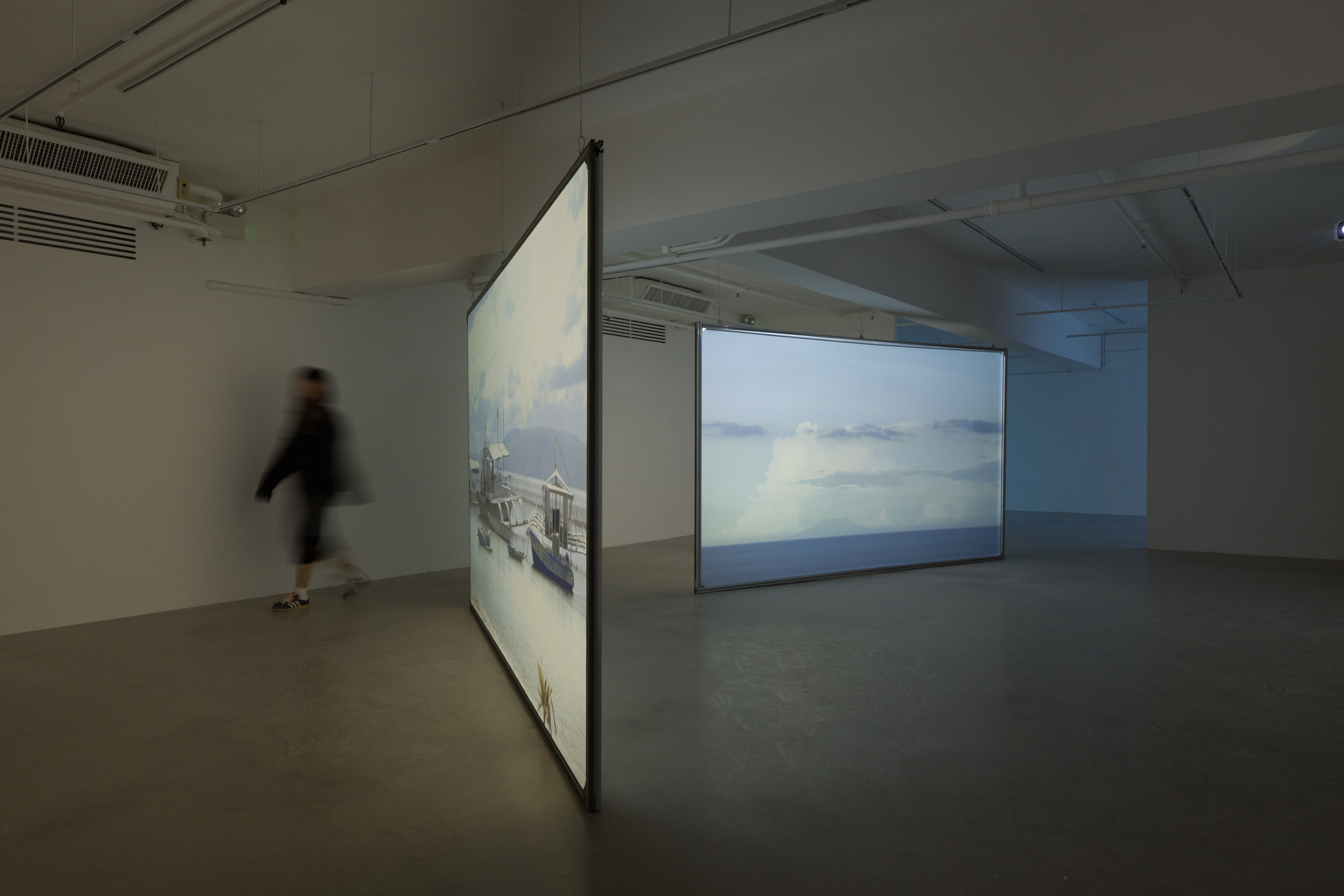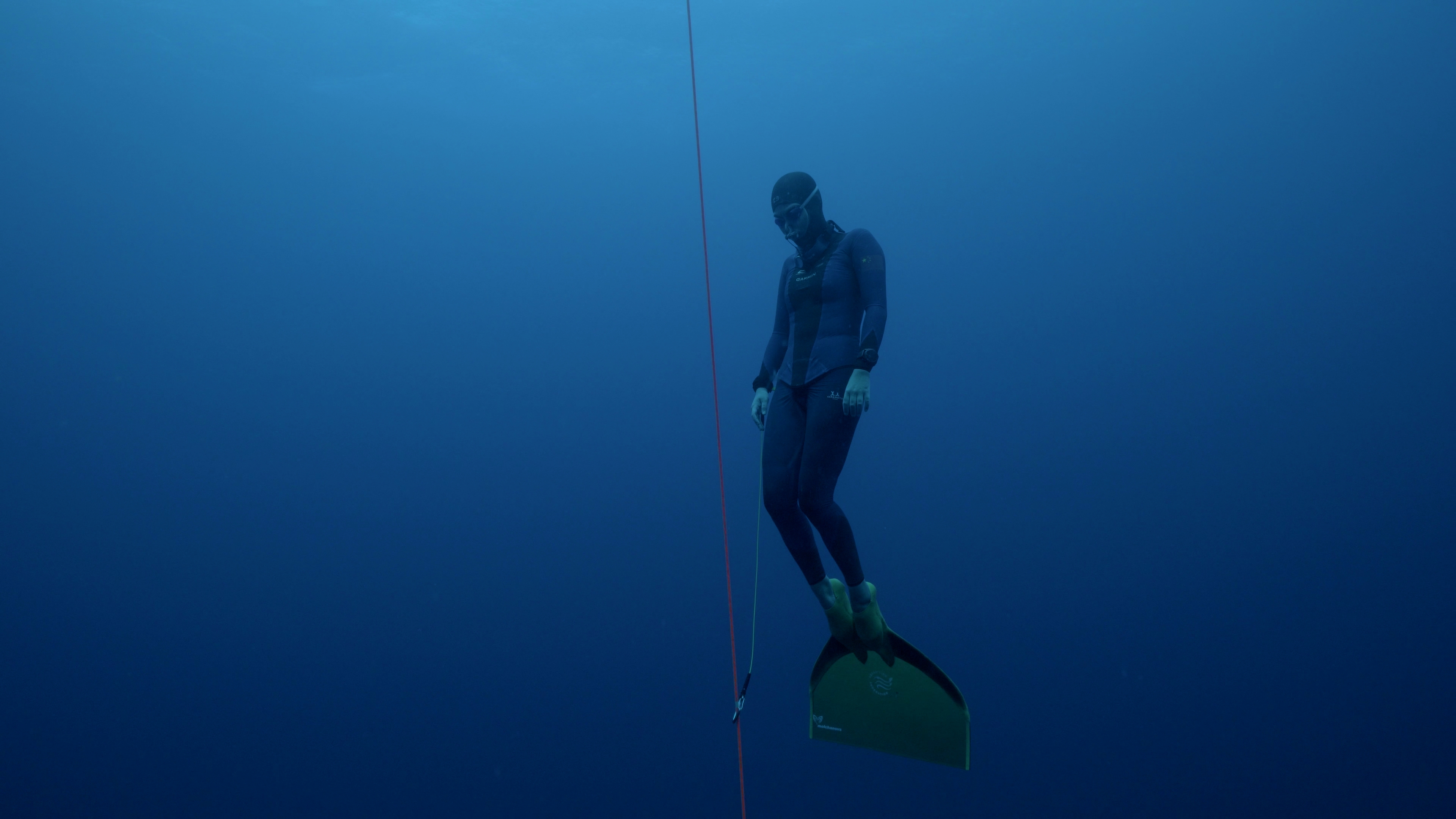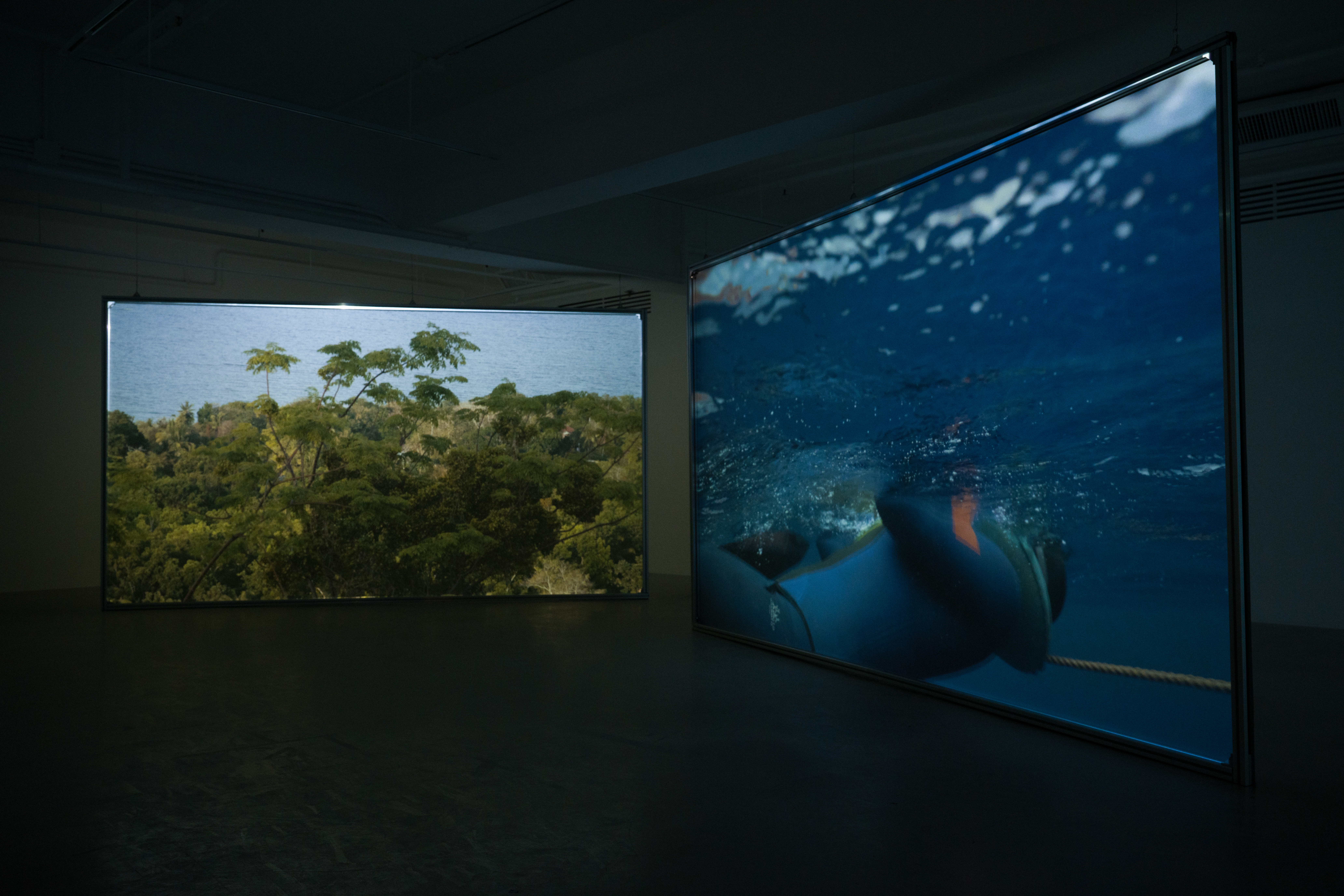 Upon entering the exhibition, visitors are greeted by Luminescence in Red (all works 2024)—a mesmerizing video capturing the nocturnal dance of fireflies in Panglao. This introductory piece sets a tone of serene hopefulness, symbolizing the intimate connection between the athletes and their natural surroundings, and serves as a prelude to the narratives that unfold within this locale. At the heart of the gallery lies the dual-channel video work Alchemy. In the dimly lit expanse of the gallery, two large-scale standalone projection screens are designed to immerse the viewers fully into the narratives and landscapes depicted. This arrangement enables a multifaceted exploration of the moving images, encouraging viewers to navigate the space and engage with the content freely. The doubled screens simultaneously offer connected yet distinct scenes of the athletes' training sessions and the oceanic environment, fostering a dialogue between the different facets of freediving portrayed. Elsewhere in the show, video interviews with the athletes are showcased, offering a first-person perspective on the life of a freediver. These personal accounts go beyond showcasing the sport's physical demands, delving into the emotional and psychological resilience required.